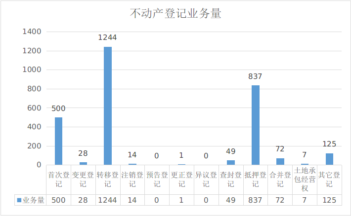 一、办理各类不动产登记情况:共计办理各类报件2877件。其中,首次登记500件、变更登记28件、转移登记1244件、注销登记14件、预告登记0件、更正登记1件、异议登记0件、查封登记49件、抵押登记837件、合并登记72件、土地承包经营权7件、其它登记125件。