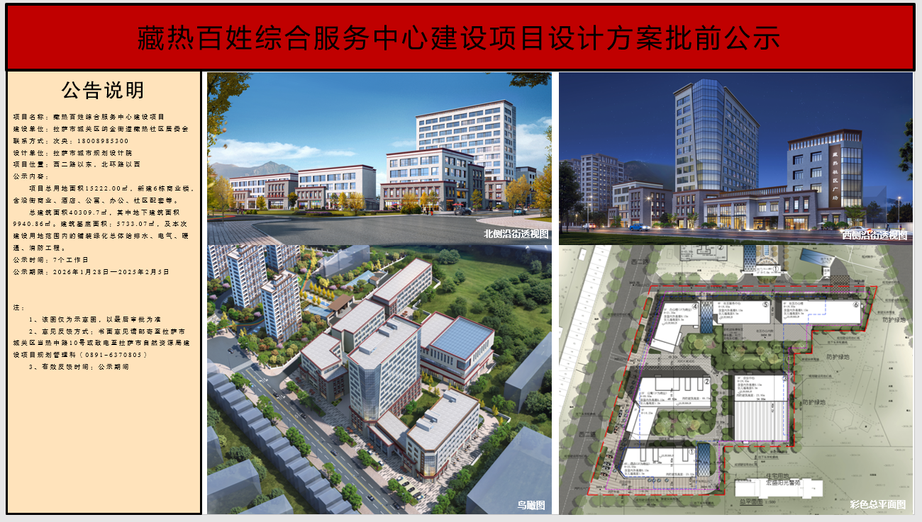 根据《中华人民共和国城乡规划法》及《拉萨市城乡规划条例》相关规定,现对藏热百姓综合服务中心建设项目《建设工程规划许可证》进行批前公示。