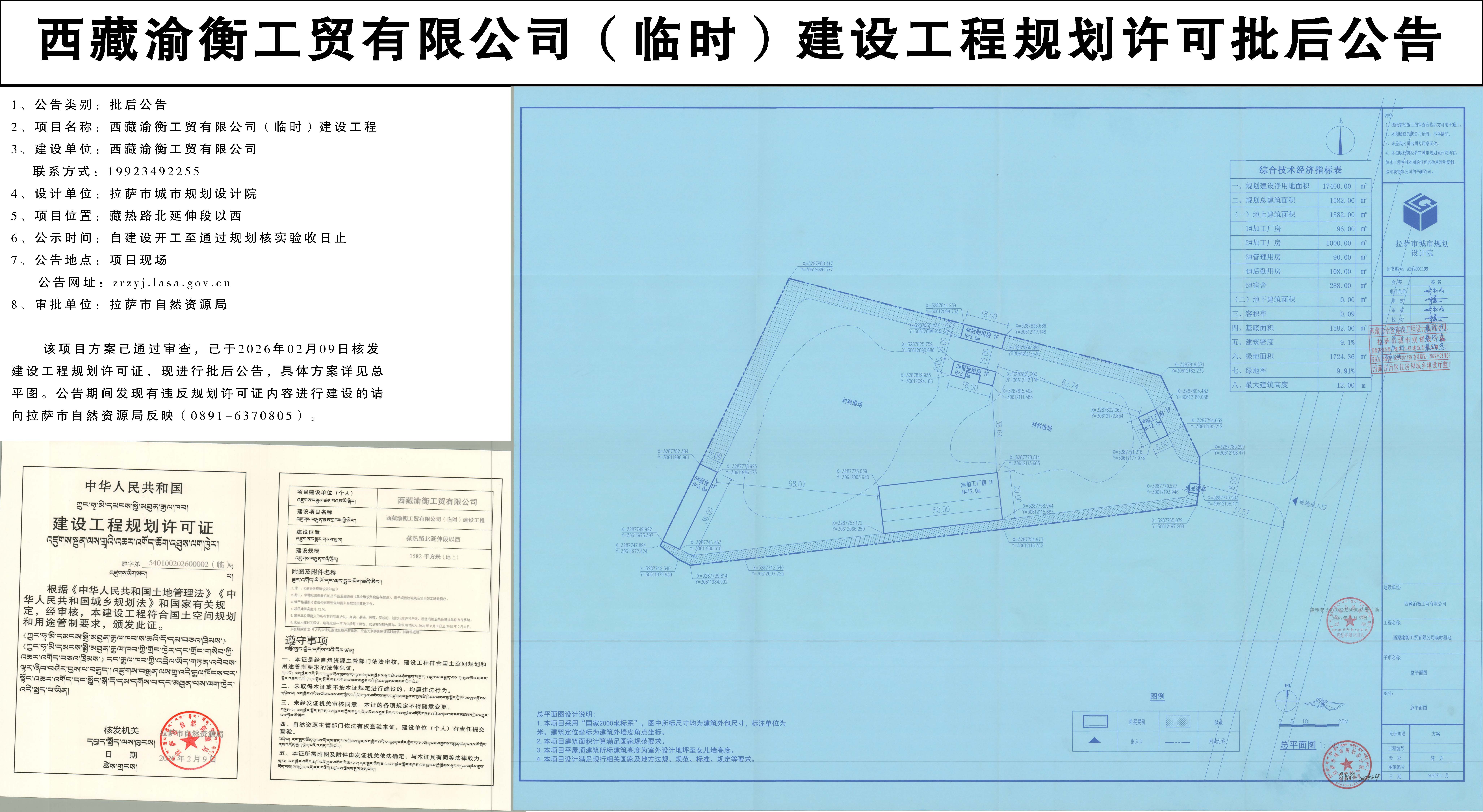 根据《中华人民共和国城乡规划法》及《拉萨市城乡规划条例》相关规定,将西藏渝衡工贸有限公司(临时)建设工程、藏热百姓综合服务中心项目《建设工程规划许可证》进行批后公告。